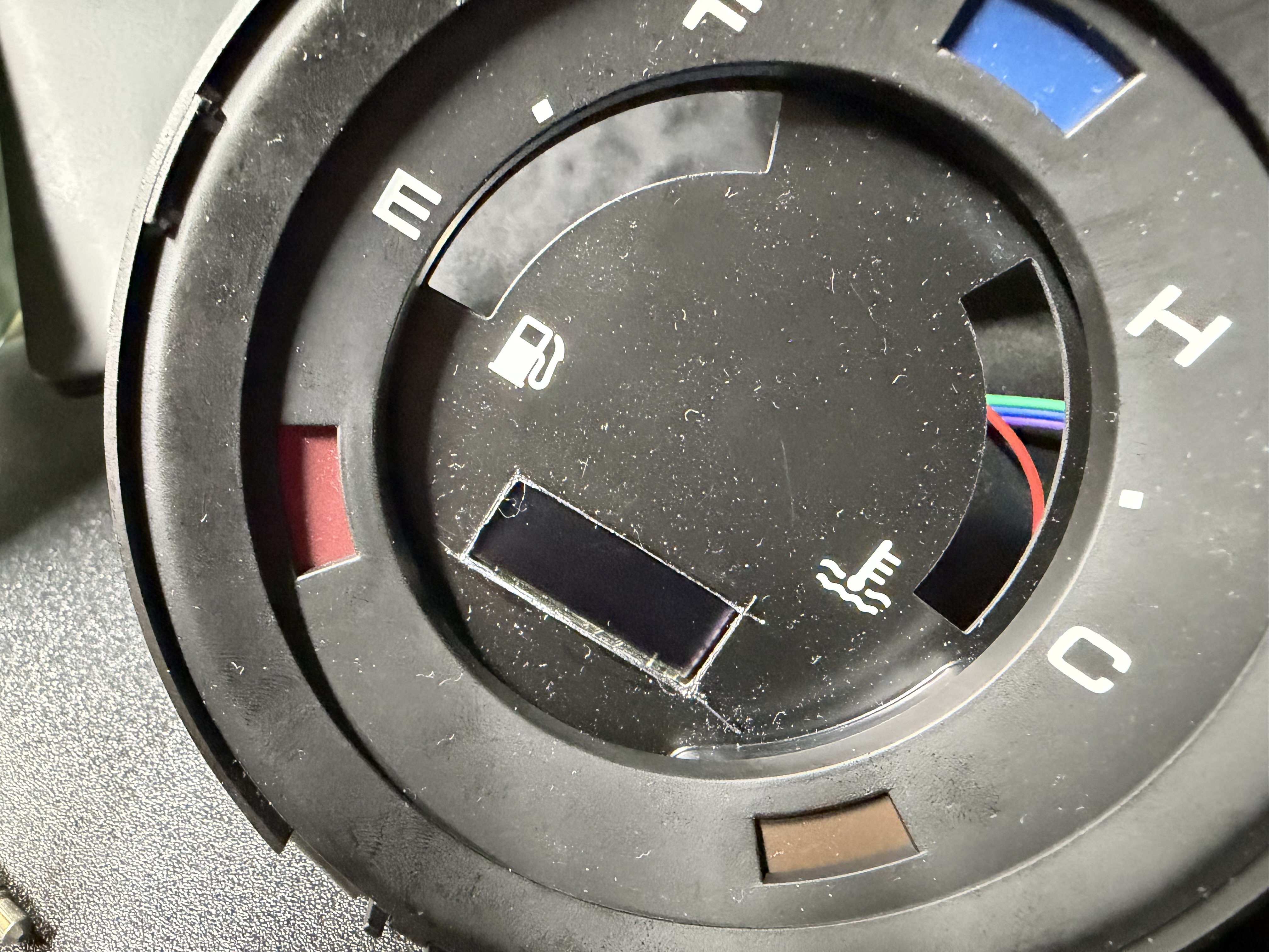 そこで、以前別の人に譲ってもらったメーターパネルで試してみた。薄いアルミ板を切るにはどうしたらいいかとAIに聞いたら、Pカッターでやるのがいいんじゃね?ということだったのでそうしたのだが、勢い余って切り込みがオーバーランしてしまった。