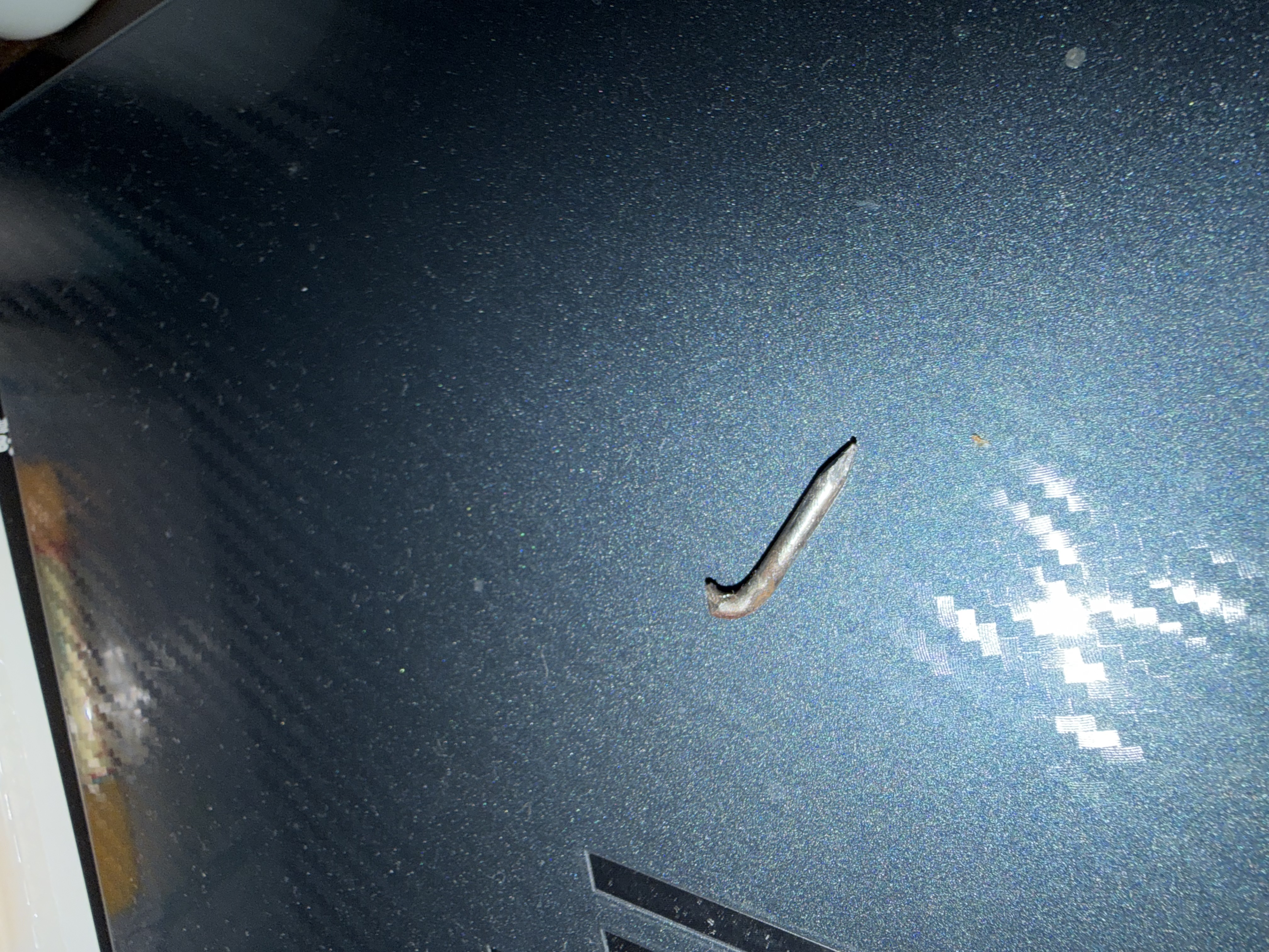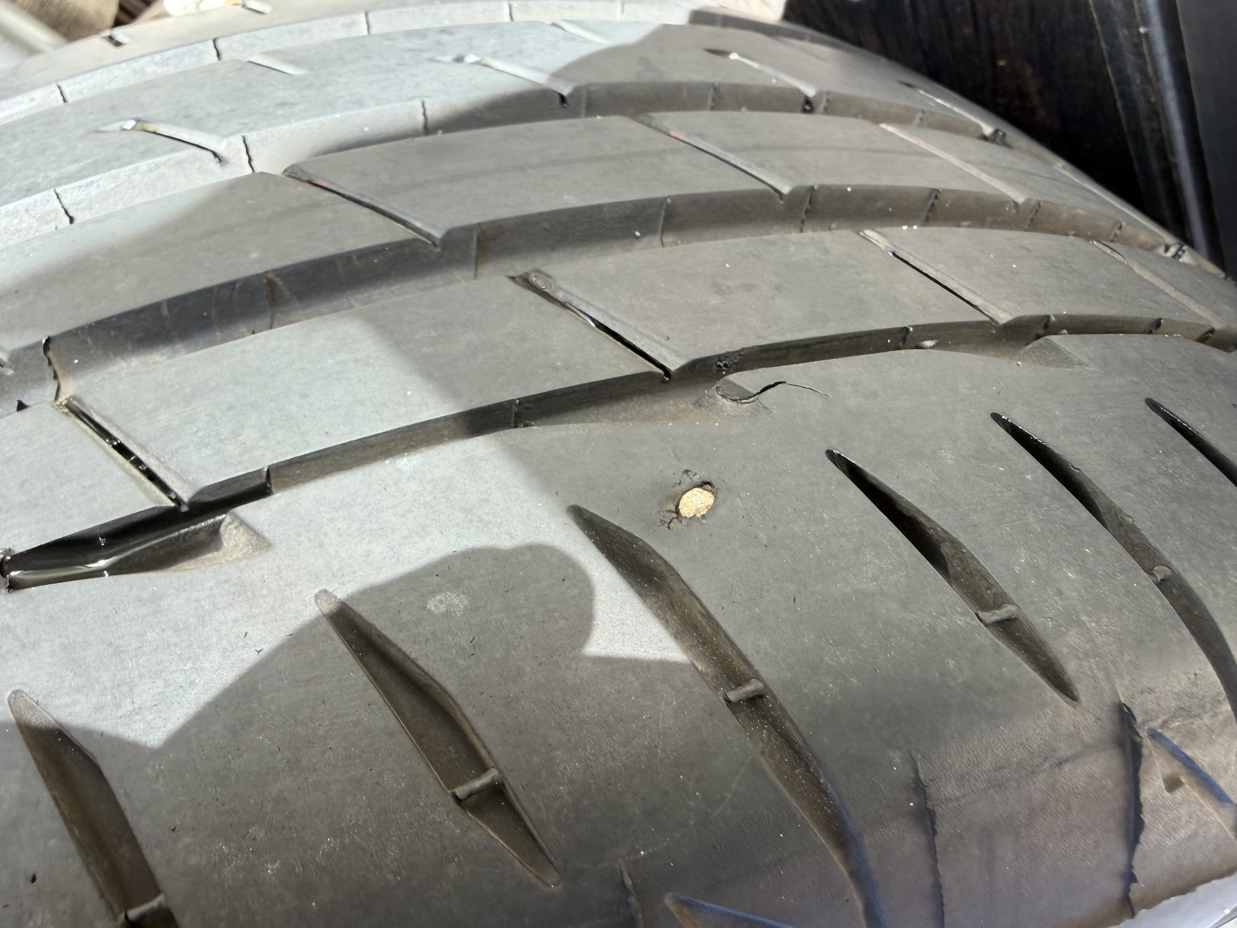 やはり釘で、ニッパや細身のラジオペンチで引き出して、最後はペンチで引き抜いた。すると、こんな釘が刺さっていたよ…。そして、エアーも漏れてきた。