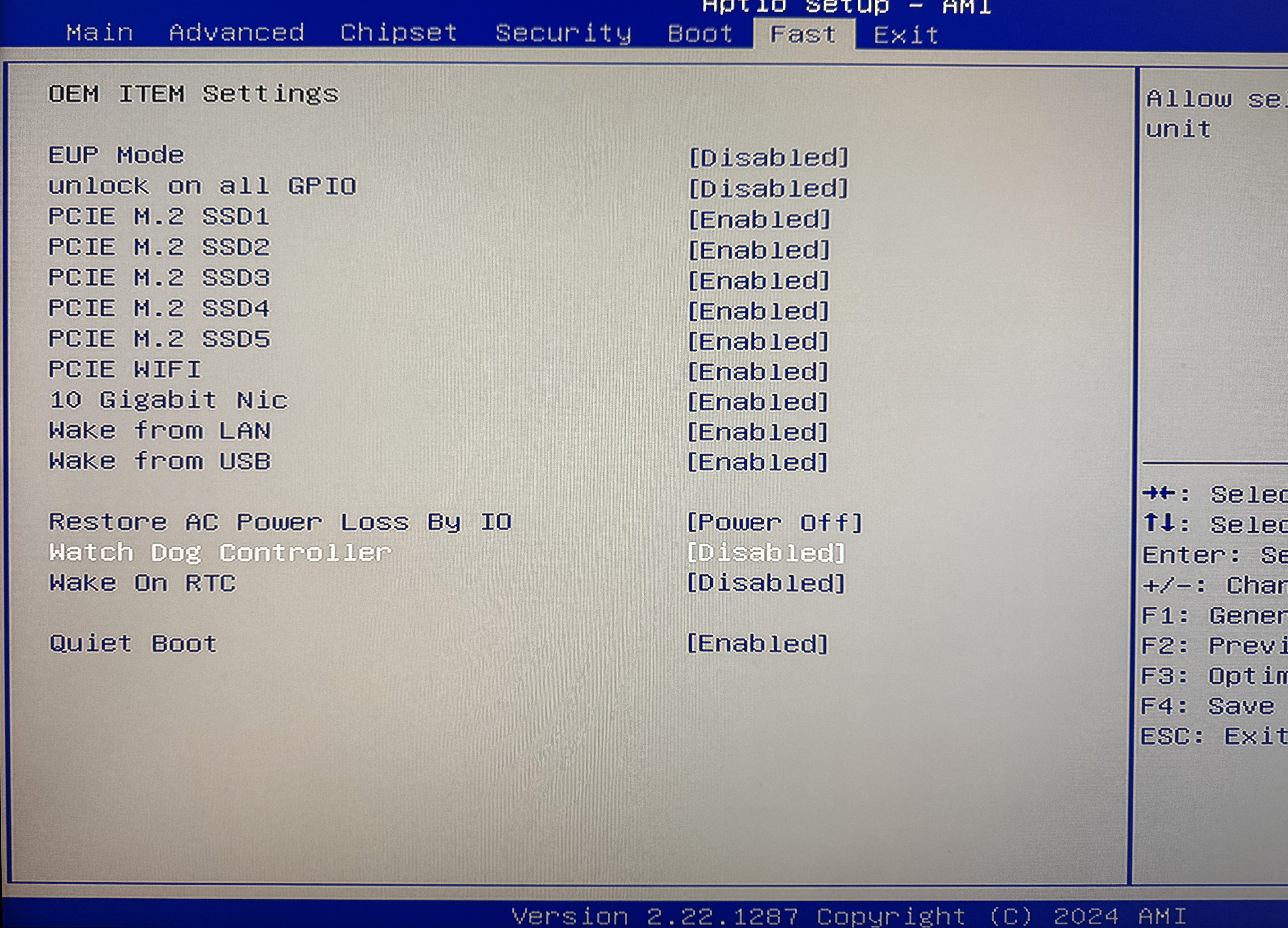 BIOS画面に入ったら矢印キー→でFastタブへ移動し、Watch Dog ControllerをDiabledにする。これをやらなと、OSインストール中に勝手にリブートしてしまう。その代わり、電源ボタンのLEDが点滅するようになる。これにはおそらくWatch Dogの設定を適切に行えば解決するのだろうが、特に支障は感じないのでそのまま使っている。