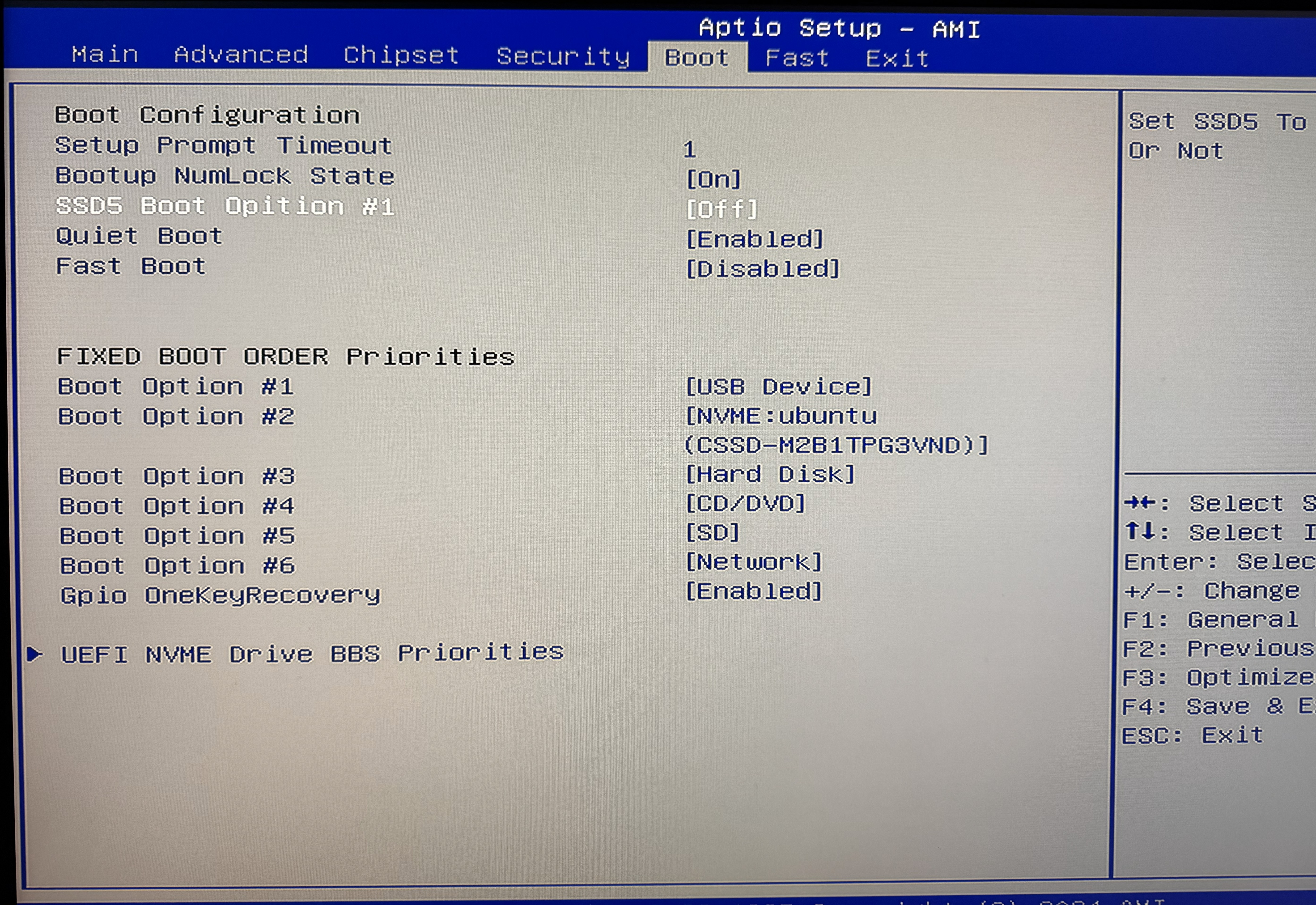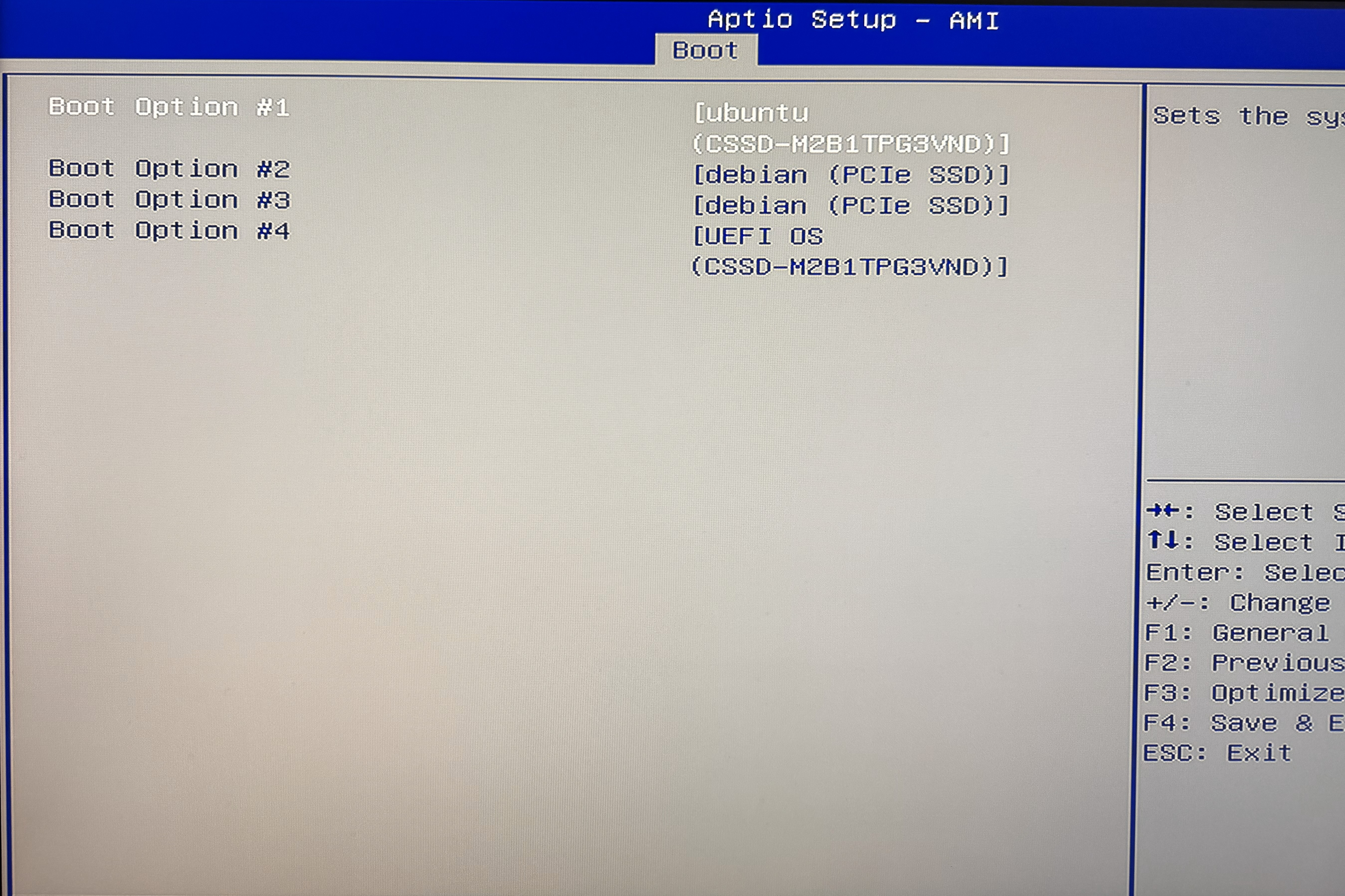 更に、BootタブでSSD Boot Option #1をOffとする。これをやらないと、SSDの起動順序変更しても内蔵のSSD(Debian)に上書きされてしまう。